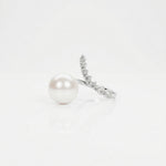 The Pearl Diamond Open Ring pairs a smooth round pearl with a curved row of round brilliant lab-grown diamonds, creating a clean open design with strong contrast and light movement.